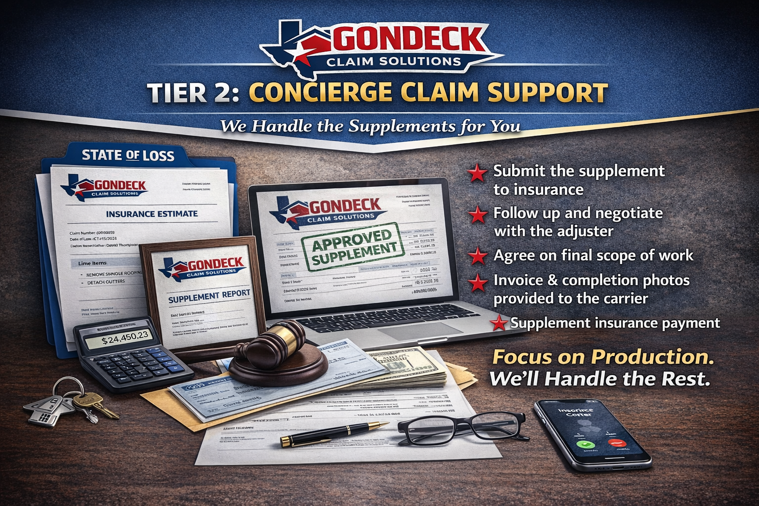 We identify missed line items, build professional supplements and help you recover more from every claim so you can focus on what you do best..